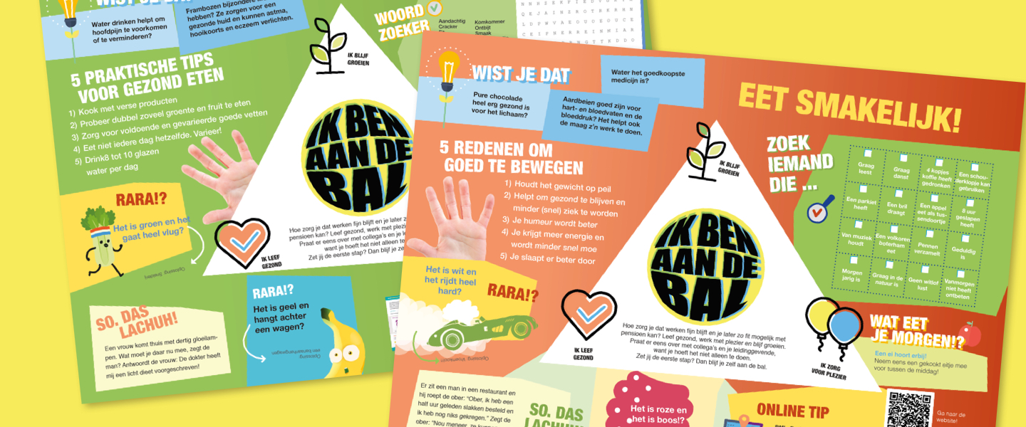 De campagne ‘Ik ben aan de bal’ helpt SW organisaties om bewustwording bij medewerkers te creëren op alle drie de pijlers: ik leef gezond, ik blijf groeien en ik werk met plezier. Daarmee kan het de start zijn van een eigen aanpak van duurzame inzetbaarheid. Wil je meer weten hoe je eigen aanpak maakt, kijk dan hier. De toolbox ‘Ik ben aan de bal’ zit vol communicatiematerialen en werkvormen om medewerkers handvatten te bieden om zelf aan de slag te gaan met hun eigen duurzame inzetbaarheid. Materialen die je zelf kunt printen of eenvoudig bij ons kunt huren.